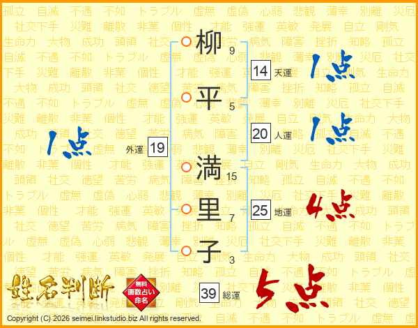 柳(9画)平(5画) 満(15画)里(7画)子(3画)