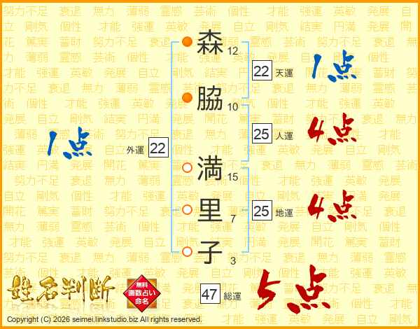 森(12画)脇(10画) 満(15画)里(7画)子(3画)