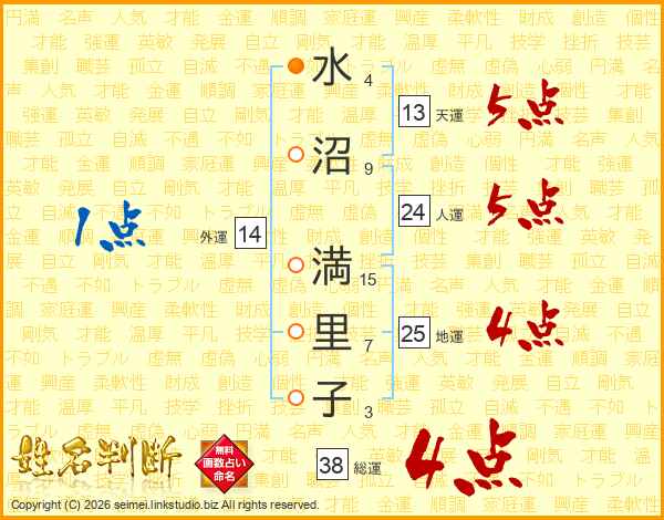 水(4画)沼(9画) 満(15画)里(7画)子(3画)