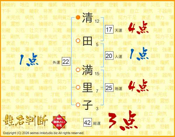 清(12画)田(5画) 満(15画)里(7画)子(3画)