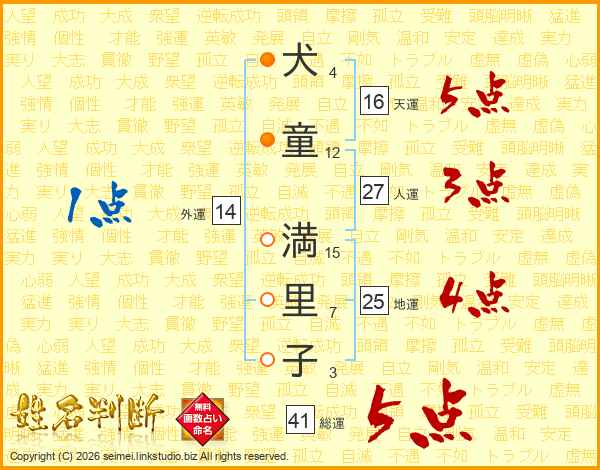 犬(4画)童(12画) 満(15画)里(7画)子(3画)
