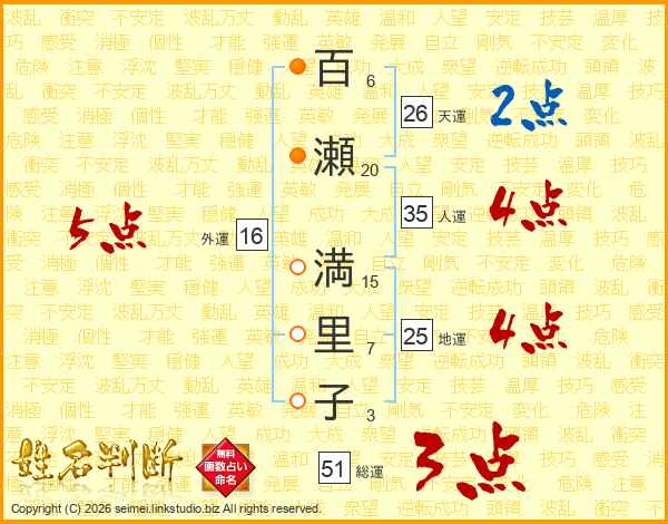百(6画)瀬(20画) 満(15画)里(7画)子(3画)