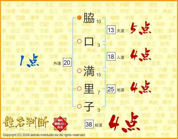 脇(10画)口(3画) 満(15画)里(7画)子(3画)