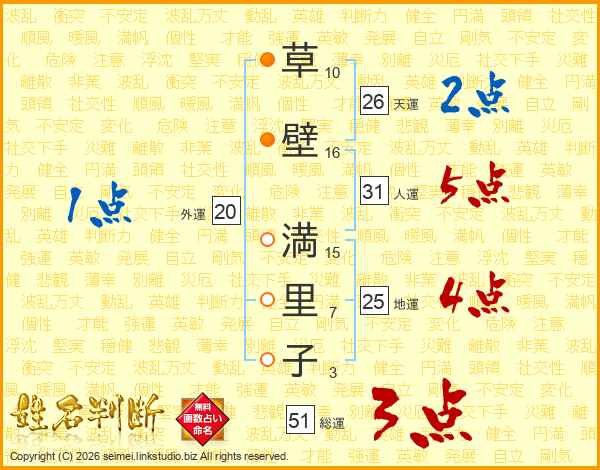 草(10画)壁(16画) 満(15画)里(7画)子(3画)