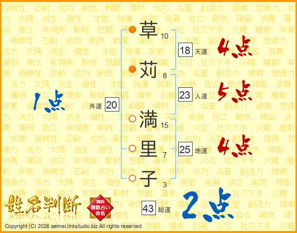 草(10画)苅(8画) 満(15画)里(7画)子(3画)