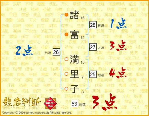 諸(16画)富(12画) 満(15画)里(7画)子(3画)
