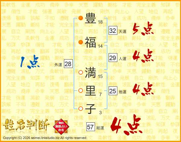 豊(18画)福(14画) 満(15画)里(7画)子(3画)