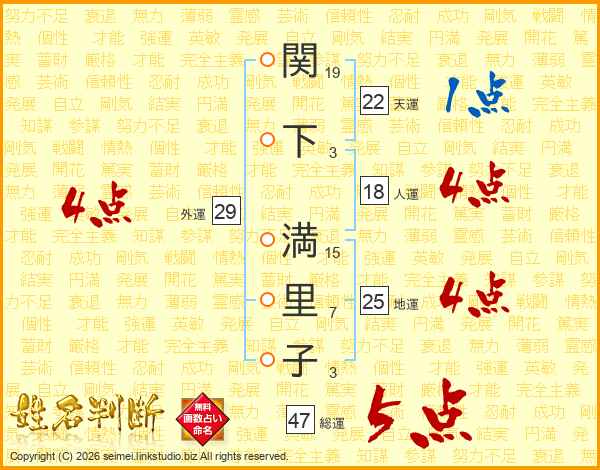 関(19画)下(3画) 満(15画)里(7画)子(3画)
