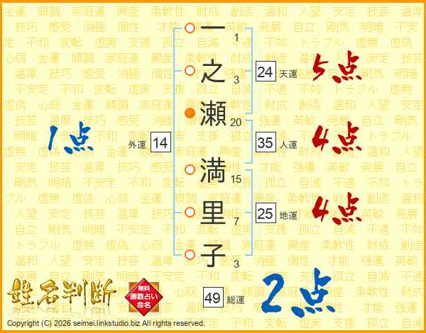 一(1画)之(3画)瀬(20画) 満(15画)里(7画)子(3画)
