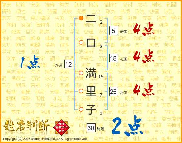 二(2画)口(3画) 満(15画)里(7画)子(3画)