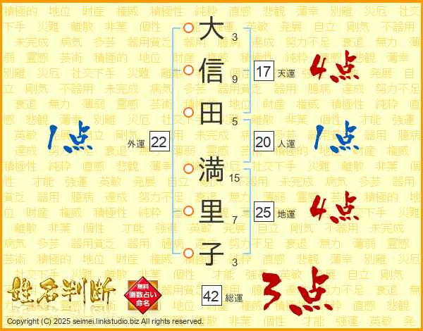 大(3画)信(9画)田(5画) 満(15画)里(7画)子(3画)