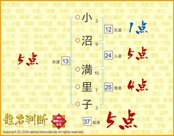 小(3画)沼(9画) 満(15画)里(7画)子(3画)