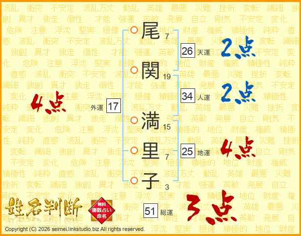尾(7画)関(19画) 満(15画)里(7画)子(3画)