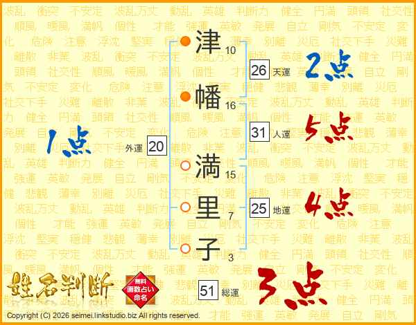 津(10画)幡(16画) 満(15画)里(7画)子(3画)
