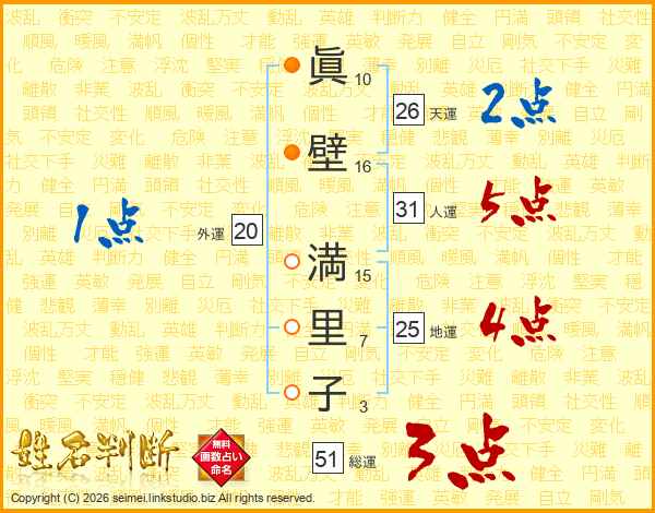 眞(10画)壁(16画) 満(15画)里(7画)子(3画)