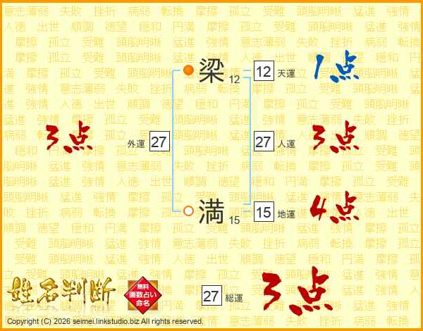 生活面を象徴する運勢です。外部から受ける影響力を表し、結婚運、家庭運や職場、環境への順応性を表します。総運から人運を引いた画数。姓や名が1文字の場合を除く。