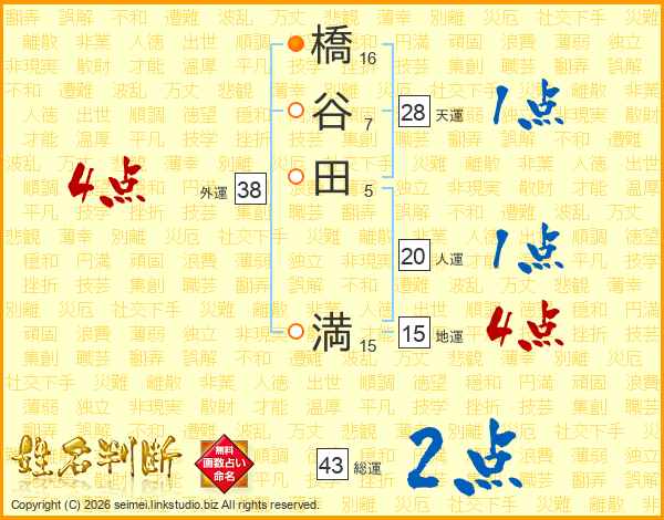 生活面を象徴する運勢です。外部から受ける影響力を表し、結婚運、家庭運や職場、環境への順応性を表します。総運から人運を引いた画数。姓や名が1文字の場合を除く。