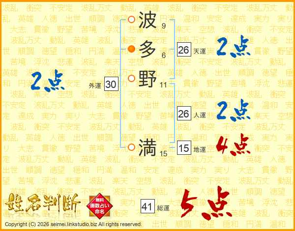 生活面を象徴する運勢です。外部から受ける影響力を表し、結婚運、家庭運や職場、環境への順応性を表します。総運から人運を引いた画数。姓や名が1文字の場合を除く。