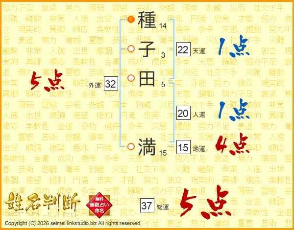 生活面を象徴する運勢です。外部から受ける影響力を表し、結婚運、家庭運や職場、環境への順応性を表します。総運から人運を引いた画数。姓や名が1文字の場合を除く。
