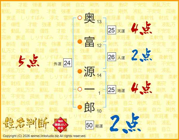 奥(13画)富(12画) 源(14画)一(1画)郎(10画)