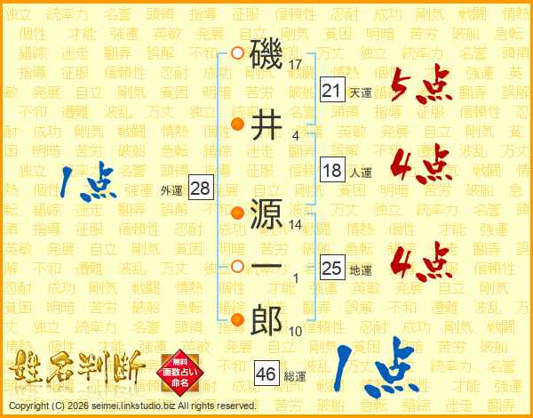 磯(17画)井(4画) 源(14画)一(1画)郎(10画)