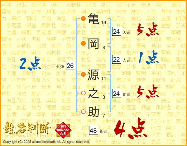 亀(16画)岡(8画) 源(14画)之(3画)助(7画)