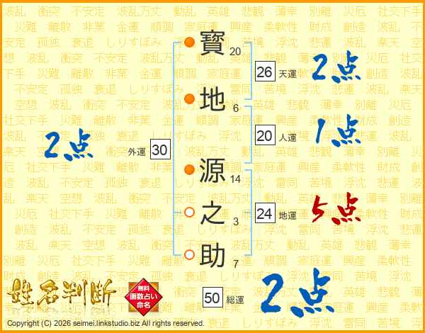 寳(20画)地(6画) 源(14画)之(3画)助(7画)