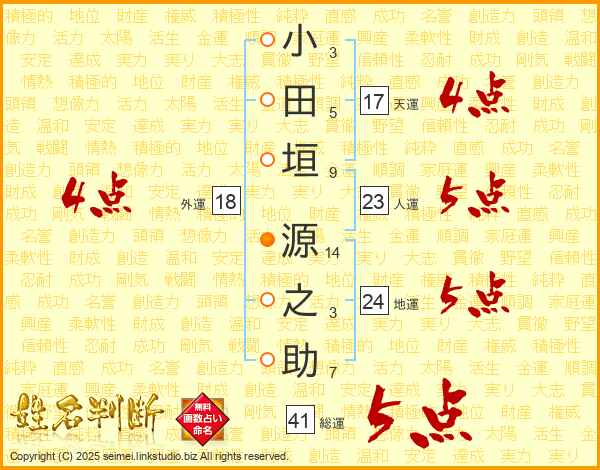 小(3画)田(5画)垣(9画) 源(14画)之(3画)助(7画)