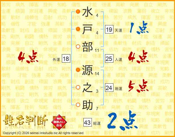 水(4画)戸(4画)部(11画) 源(14画)之(3画)助(7画)