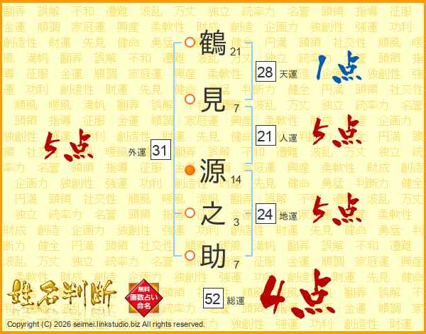 鶴(21画)見(7画) 源(14画)之(3画)助(7画)