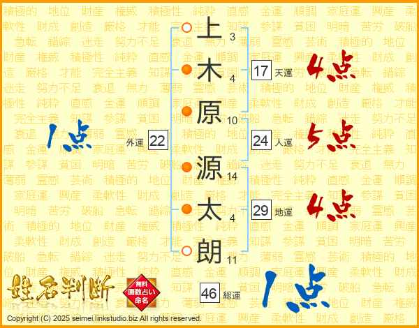 上(3画)木(4画)原(10画) 源(14画)太(4画)朗(11画)