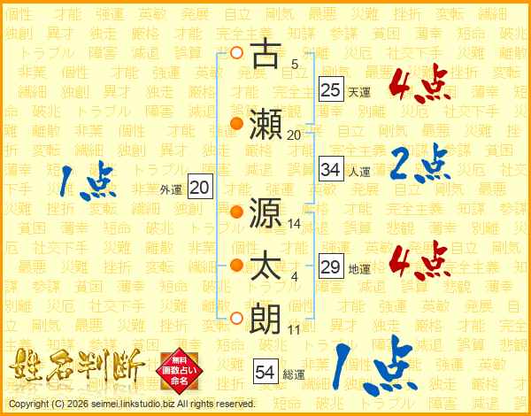 古(5画)瀬(20画) 源(14画)太(4画)朗(11画)