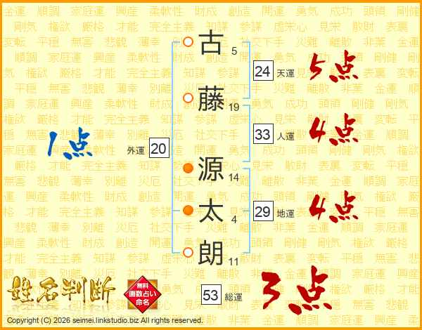 古(5画)藤(19画) 源(14画)太(4画)朗(11画)