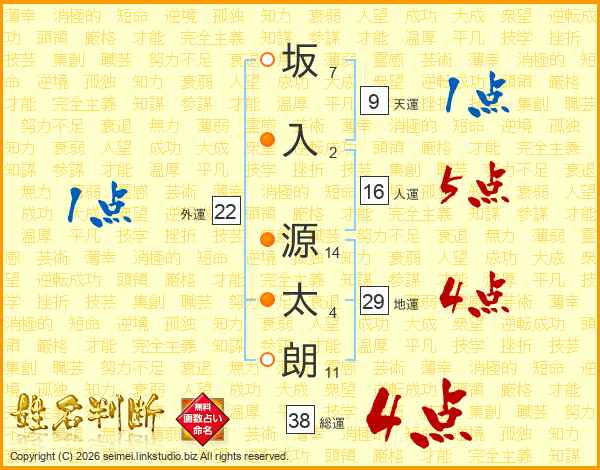 坂(7画)入(2画) 源(14画)太(4画)朗(11画)