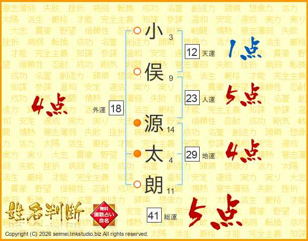 小(3画)俣(9画) 源(14画)太(4画)朗(11画)