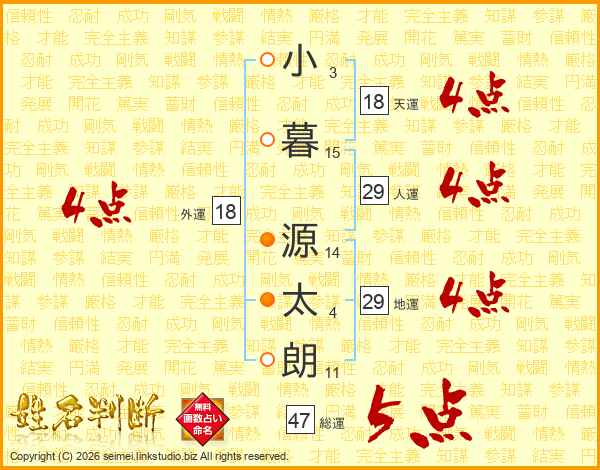 小(3画)暮(15画) 源(14画)太(4画)朗(11画)