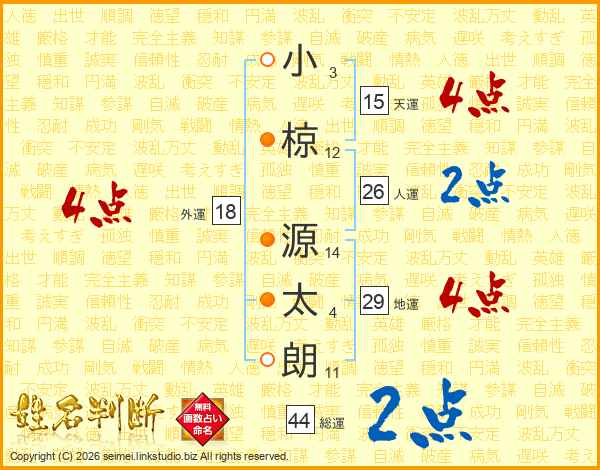 小(3画)椋(12画) 源(14画)太(4画)朗(11画)