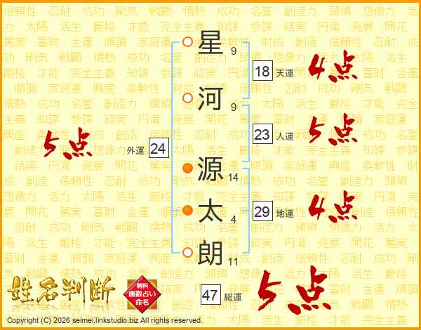 星(9画)河(9画) 源(14画)太(4画)朗(11画)