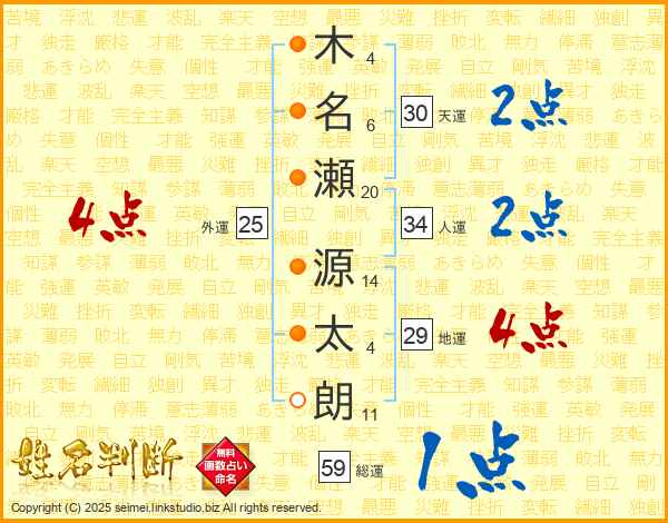 木(4画)名(6画)瀬(20画) 源(14画)太(4画)朗(11画)