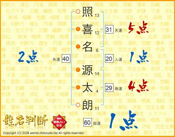 照(13画)喜(12画)名(6画) 源(14画)太(4画)朗(11画)