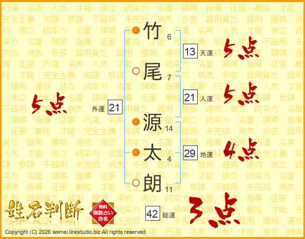 竹(6画)尾(7画) 源(14画)太(4画)朗(11画)
