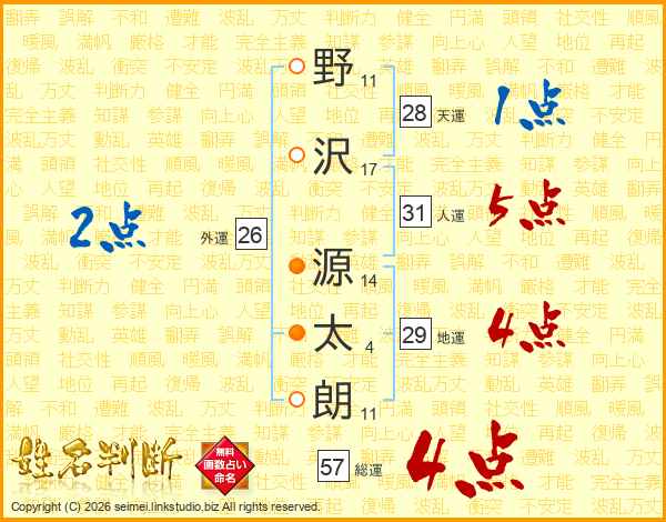 野(11画)沢(17画) 源(14画)太(4画)朗(11画)