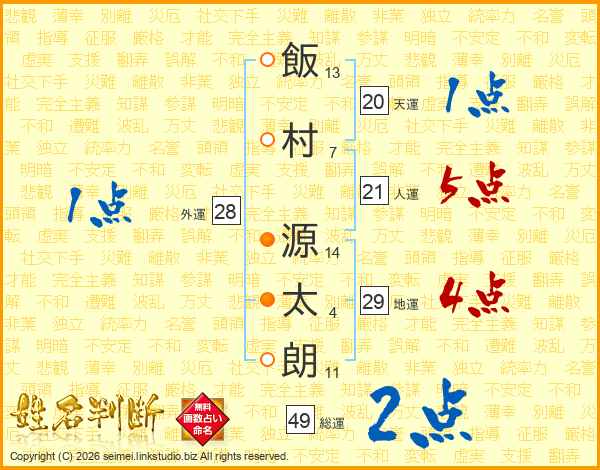 飯(13画)村(7画) 源(14画)太(4画)朗(11画)