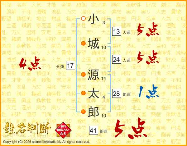 小(3画)城(10画) 源(14画)太(4画)郎(10画)