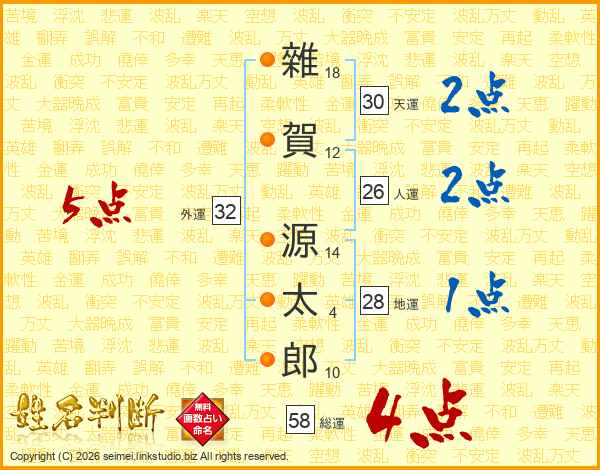 雜(18画)賀(12画) 源(14画)太(4画)郎(10画)