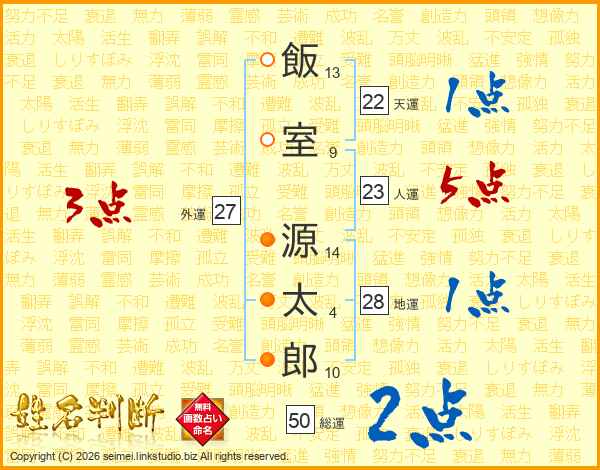 飯(13画)室(9画) 源(14画)太(4画)郎(10画)