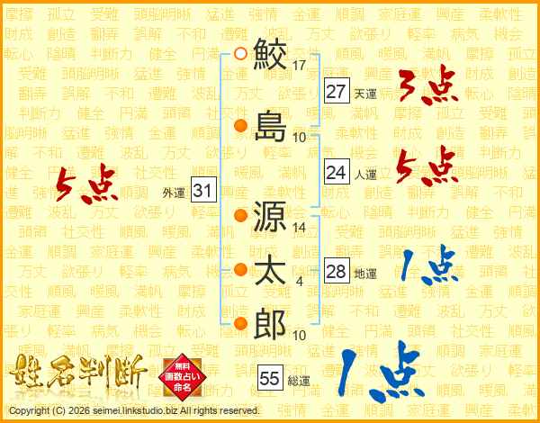 鮫(17画)島(10画) 源(14画)太(4画)郎(10画)