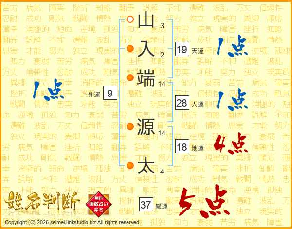 山(3画)入(2画)端(14画) 源(14画)太(4画)