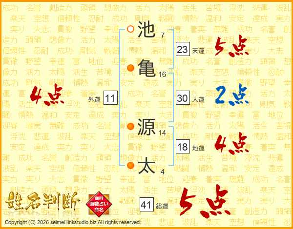 あなたの人生を表す1番重要な運勢です。生涯を通じて影響する総合運となり、主に50歳以降の晩年期に影響を及ぼします。苗字と名前の合計画数。