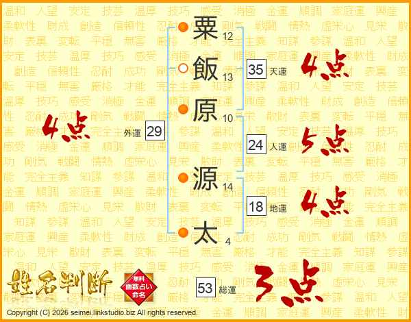 粟(12画)飯(13画)原(10画) 源(14画)太(4画)